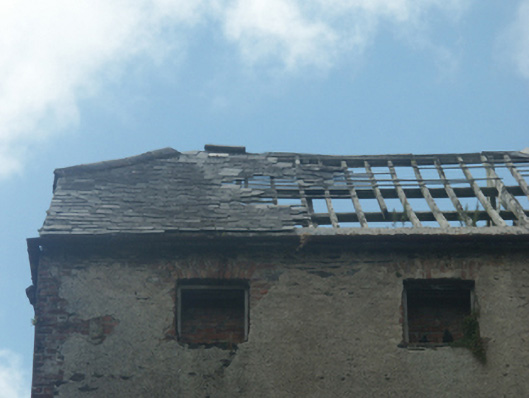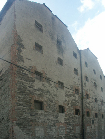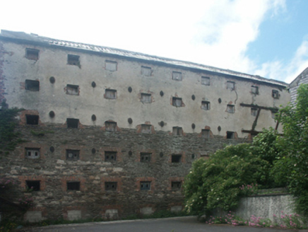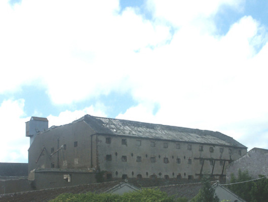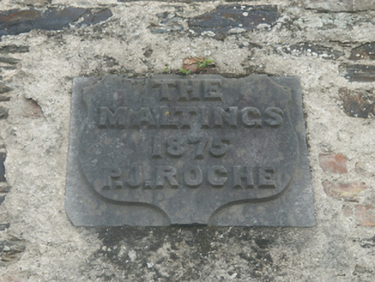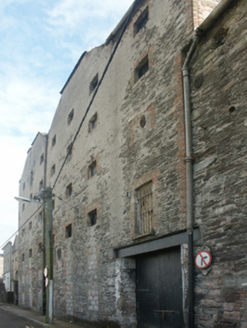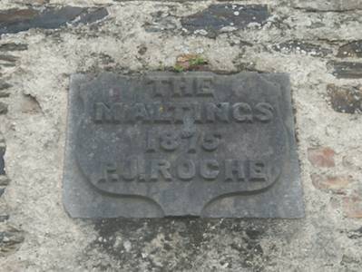 Archival Description [Demolished ----]: Detached six-bay (twelve-bay deep) six-storey double hipped gable-fronted malthouse, dated 1875, on a rectangular plan. Disused, 2007. Double hipped gable-fronted (north) and pitched (south) slate roof on collared timber construction with clay ridge tiles, and cast-iron rainwater goods on slate flagged eaves retaining cast-iron octagonal or ogee hoppers and downpipes. Part creeper- or ivy-covered lime rendered or roughcast coursed rubble stone walls with concealed red brick flush quoins to corners centred on cast-iron "Pattress" tie plates. Square-headed window openings with concealed red brick block-and-start surrounds framing remains of timber boarded fittings behind wrought iron bars. Lane fronted with concrete footpath to front.