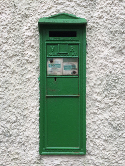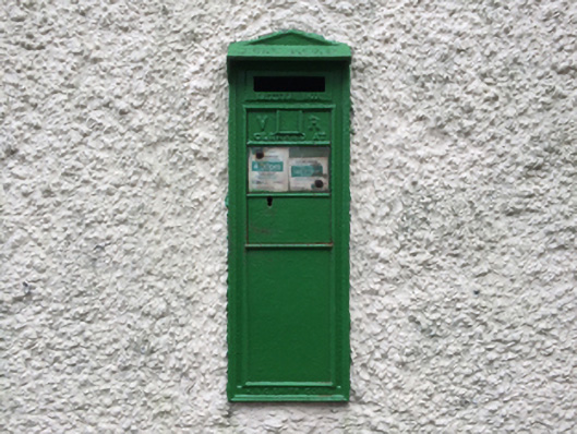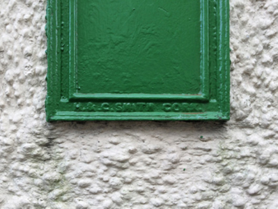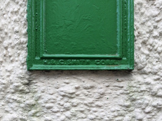 A "Second National Standard Small Wall Box" post box supplied by H. and C. Smith of the King Street Iron Works, Cork, representing an interesting example of mass-produced cast-iron work making a pleasing, if largely inconspicuous visual statement in an urban street scene with embellishments identifying the artistic potential of the composition including the Queen Victoria (1819-1901; r. 1837-1901) royal cipher of additional significance as an imprinted reminder of the period when Ireland formed part of the British Empire.