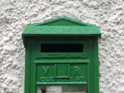 Wall-mounted cast-iron "wall box" post box, between 1882-1901; extant 1902, with "VR [Victoria Regina]" royal cipher. Repositioned, ----. Set in roughcast boundary wall.