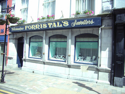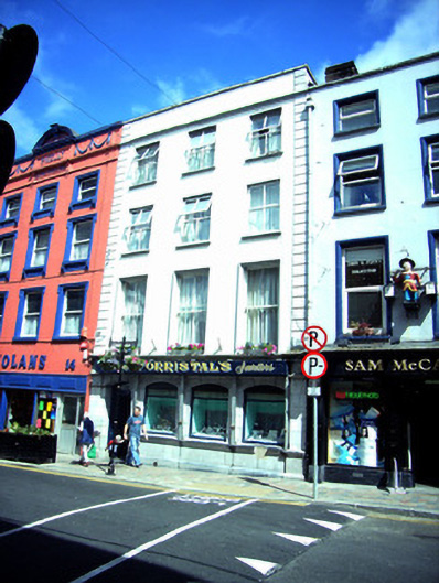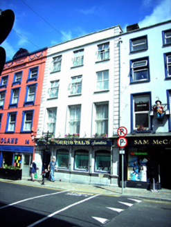 Terraced three-bay four-storey house with dormer attic, c.1800. Renovated and refenestrated, c.1925, with replacement shopfront inserted to ground floor possibly to accommodate use as bank. Mostly refenestrated. Pitched slate roof behind parapet with clay ridge tiles, rendered (shared) chimney stack having stepped capping supporting yellow terracotta pots, rendered coping, rooflights, and concealed rainwater goods having shared iron hopper and downpipe. Rendered, ruled and lined walls with rendered channelled piers to ends, and moulded course supporting parapet, c.1925, having coping. Square-headed window openings with moulded sills, c.1925, moulded rendered surrounds, c.1925, to first floor, and replacement uPVC casement windows retaining replacement two-over-two timber sash windows, c.1925, to first floor. Replacement limestone ashlar shopfront, c.1925, to ground floor on limestone ashlar chamfered base with limestone ashlar terminating pilasters on pedestals, carved cut-limestone sill course, carved cut-limestone mullions dividing camber-headed openings having bull-nose reveals, fixed-pane timber display windows, timber panelled double doors on cut-limestone threshold having overlight, and replacement box fascia on carved cut-limestone stringcourse having carved cut-limestone cornice. Interior retaining timber panelled shutters to some window openings. Street fronted with concrete brick cobbled footpath to front.