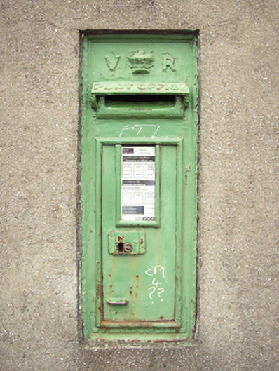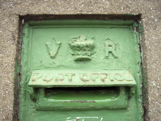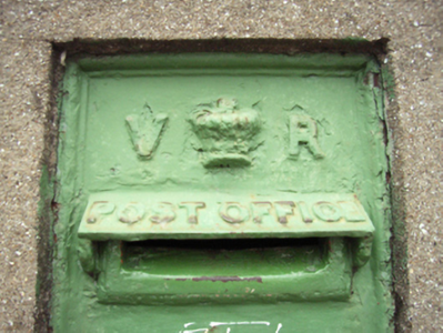 Wall-mounted cast-iron "wall box" post box, between 1882-1901; extant 1902, with "VR [Victoria Regina]" royal cipher. Repositioned, ----. Set in rendered wall.