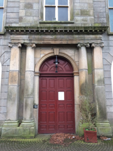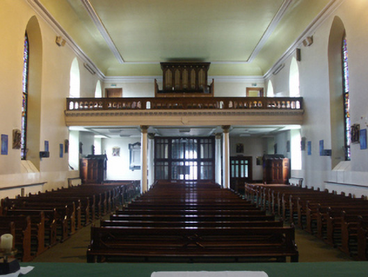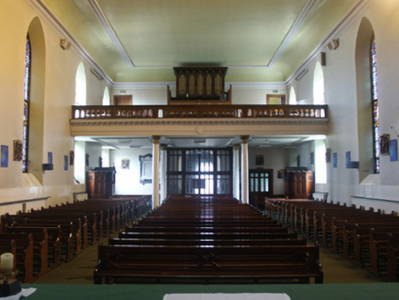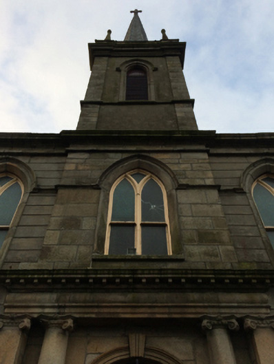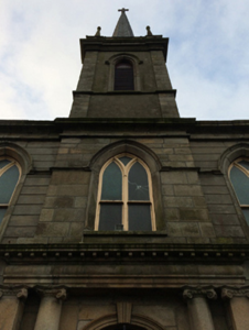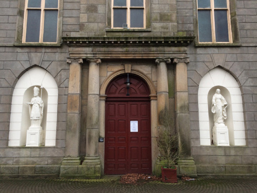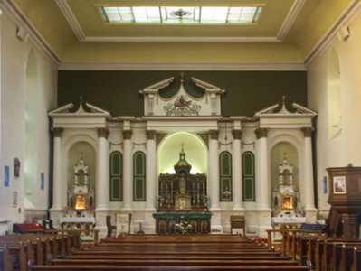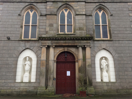 Attached five-bay double-height single-cell Catholic church, built 1832-5; opened 1835, on a rectangular plan originally detached with single-bay three-stage engaged tower to entrance (north) front on a square plan supporting octagonal spire. Dedicated, 1856. Renovated, ----, with sanctuary reordered. Hipped and pitched slate roof behind parapet (north) with clay ridge tiles, rooflights (south), and cast-iron rainwater goods on eaves boards on rendered eaves retaining cast-iron downpipes. Rendered walls on chamfered cushion course on rendered base; rusticated rendered wall to entrance (north) front on cut-granite chamfered plinth with rusticated cut-granite quoins to corners supporting cut-granite cornice on blind frieze on monolithic entablature below parapet; rendered surface finish (tower) with granite ashlar piers to corners supporting cut-granite cornice on blind frieze on monolithic entablature below octagonal pinnacle-topped panelled parapet. Pointed-arch window openings with cut-granite sills, timber Y-mullions, and cut-granite surrounds having chamfered reveals framing storm glazing over fixed-pane fittings having margins centred on leaded stained glass panels. Square-headed door openings (north) with cut-granite monolithic surrounds framing timber panelled double doors. Pointed-arch niches centred on round-headed door opening to entrance (north) front, cut-granite threshold, cut-granite doorcase with Ionic pilasters centred on Ionic columns supporting dentilated "Cyma Recta"- or "Cyma Reversa"-detailed cornice on pulvinated frieze on entablature framing timber panelled double doors having overpanel. Pointed-arch window openings with cut-granite sills, timber Y-mullions, and cut-granite surrounds having chamfered reveals with hood mouldings framing fixed-pane timber fittings. Lancet openings (tower) with cut-granite sill course, and cut-granite surrounds having chamfered reveals with hood mouldings framing louvered timber fittings. Interior including vestibule (north) with "terrazzo" floor centred on mosaic tiled roundel; square-headed door opening into nave with glazed timber panelled double doors having sidelights on panelled risers below overlight; full-height interior with choir gallery (north) on paired Composite pillars supporting timber panelled pipe organ, pair of Classical-style confessional boxes, carpeted aisles between timber pews, replacement stations between stained glass memorial windows (----), stepped dais to sanctuary (south) reordered, ----, with Classical-style reredos centred on Classical-style high altar, and moulded plasterwork cornice to coved ceiling centred on stained glass rooflight in moulded plasterwork frame. Set in landscaped grounds with cast-iron "bird cage" piers to perimeter having ball finial-topped curvilinear pyramidal capping supporting "Fleur-de-Lys"-detailed wrought iron double gates.