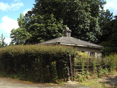 Detached three-bay single-storey gate lodge, extant 1840, on a rectangular plan. Now disused. Hipped slate roof with clay ridge tiles centred on rendered chimney stack having corbelled stepped chamfered capping supporting terracotta pots, and remains of cast-iron rainwater goods on slightly overhanging timber boarded box eaves. Roughcast walls. Square-headed central door opening with overgrown threshold, and concealed dressings framing timber boarded door. Square-headed flanking window openings with cut-granite sills, and concealed dressings framing timber casement windows. Set back from line of road at entrance to grounds of Brookville.