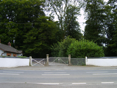 Gateway, extant 1903, on a symmetrical plan comprising pair of cut-granite monolithic piers on stepped plinths having shallow pyramidal capping supporting finial-topped wrought iron double gates with benchmark-inscribed cut-granite monolithic outer piers having rounded capping supporting wrought iron railings. Street fronted at entrance to grounds of Camolin House.