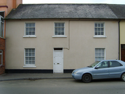 Terraced three-bay two-storey house, extant 1904, on a rectangular plan originally with shopfront to left ground floor. Renovated, ----. Replacement pitched artificial slate roof with ridge tiles, and cast-iron rainwater goods on rendered eaves retaining cast-iron downpipe. Replacement cement rendered walls on rendered chamfered plinth. Square-headed central door opening with conceal dressings framing replacement timber panelled door having overlight. Square-headed window openings with concrete sills, and concealed dressings framing six-over-six (ground floor) or three-over-six (first floor) timber sash windows. Street fronted with concrete brick cobbled footpath to front.