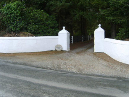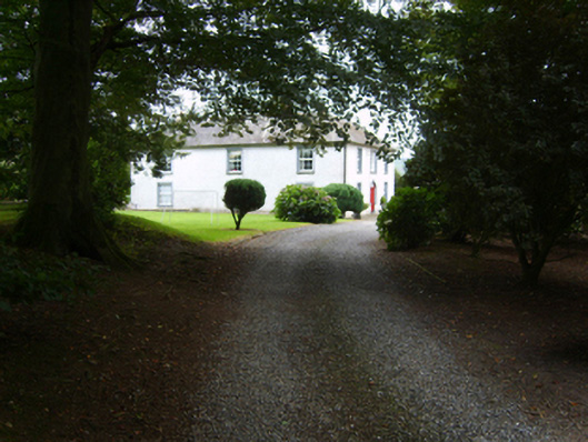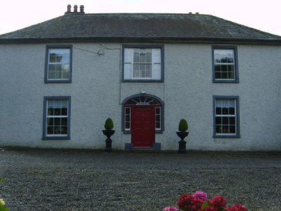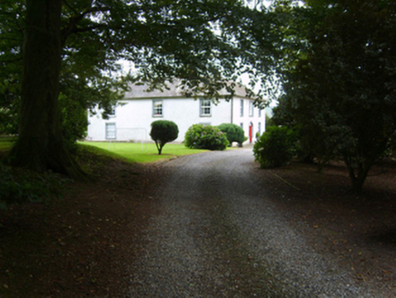 Detached three-bay two-storey farmhouse, extant 1839, on an L-shaped plan with single-bay (west) or three-bay (east) two-storey side elevations. Occupied, 1901; 1911. Sold, 1965. Refenestrated, 1995. Hipped slate roof on an L-shaped plan with clay ridge tiles, red brick Running bond chimney stacks on axis with ridge having corbelled stepped capping supporting terracotta tapered pots, and cast-iron rainwater goods on roughcast eaves retaining cast-iron downpipes. Roughcast walls. Hipped segmental-headed central door opening, timber doorcase with panelled pilasters on cut-granite step threshold supporting "Cyma Recta" or "Cyma Reversa" cornice, and rendered "bas-relief" surround framing timber panelled door having sidelights below fanlight. Square-headed window openings centred on square-headed window opening in tripartite arrangement (first floor) with cut-granite sills, and rendered "bas-relief" surrounds framing replacement uPVC casement windows replacing six-over-six timber sash windows centred on six-over-six timber sash windows having two-over-two blind sidelights. Interior including (ground floor): central hall retaining carved timber surrounds to door openings framing timber panelled doors; and carved timber surrounds to door openings to remainder framing timber panelled doors with timber panelled shutters to window openings. Set in landscaped grounds with limewashed rendered piers to perimeter having domed pyramidal capping.