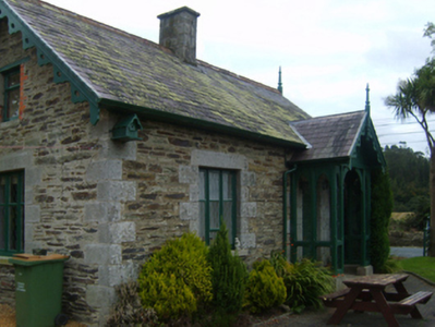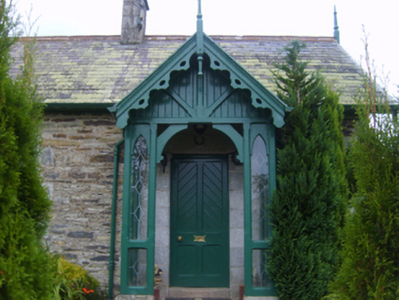 Detached two-bay single-storey gate lodge with dormer attic, occupied 1901, on a rectangular plan. Renovated, ----. Pitched slate with roll moulded terracotta ridge tiles centred on tuck pointed granite ashlar chimney stack having lichen-covered capping, perforated decorative timber bargeboards to gables on timber purlins with timber finials to apexes, and cast-iron rainwater goods on box eaves retaining cast-iron downpipes. Tuck pointed coursed or snecked rubble stone walls with margined cut-granite flush quoins to corners. Square-headed window openings in tripartite arrangement with cut-granite sills, and margined cut-granite block-and-start surrounds framing timber casement windows having lattice glazing bars. Set back from line of road at entrance to grounds of Mount Saint Benedict.
