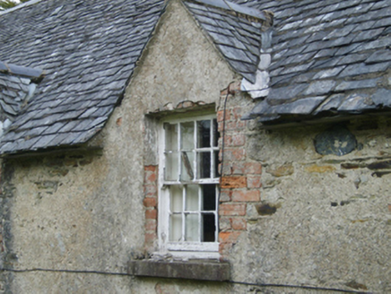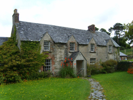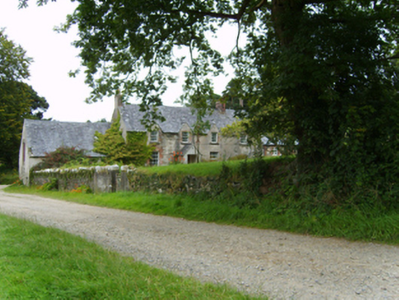 Detached four-bay single-storey farmhouse with half-dormer attic, extant 1831, on a cruciform plan originally three-bay single-storey centred on single-bay single-storey projecting open porch; single-bay (single-bay deep) single-storey central return (east). Occupied, 1901; 1911. Now disused. Pitched slate roof on a T-shaped plan including gablets to window openings to half-dormer attic; pitched (gabled) slate roof (porch), clay ridge tiles, red brick Running bond chimney stacks having stepped capping supporting terracotta tapered pots, and no rainwater goods surviving on slate flagged eaves. Part creeper- or ivy-covered lime rendered coursed rubble stone battered walls with concealed rough hewn granite flush quoins to corners. Square-headed central door opening into farmhouse with concealed red brick block-and-start surround framing timber panelled door. Square-headed window openings with cut-granite sills, and concealed red brick block-and-start surrounds framing eight-over-eight timber sash windows. Set in landscaped grounds with monolithic piers to perimeter having rough hewn granite capping supporting wrought iron gate.