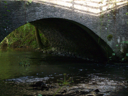 Single-arch road bridge over river, extant 1839. Damaged, 1919. Bypassed, ----. Now disused. Creeper- or ivy-covered wall (north) between moss-covered rendered battered buttresses with overgrown rendered rounded coping to parapet; roughcast surface finish (south) with rendered rounded coping to parapet. Single segmental arch with rubble stone voussoirs (north) or roughcast voussoirs (south). Sited spanning River Glasha with unkempt banks to river.
