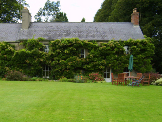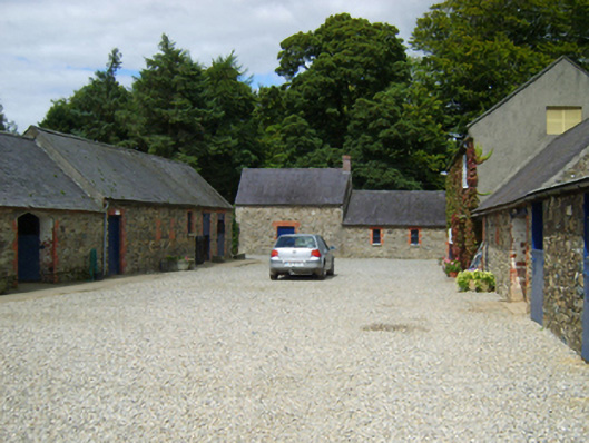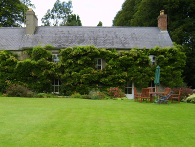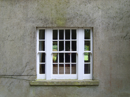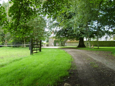 Detached three- or five-bay two-storey farmhouse, extant 1814, on a T-shaped plan centred on single-bay single-storey flat-roofed projecting porch to ground floor; four-bay two-storey rear (south) elevation. Extended, pre-1901, producing present composition. Occupied, 1911. Sold, 1945. Pitched slate roof with clay ridge tiles terminating in red brick Running bond (east) or rendered (west) chimney stacks having corbelled stepped stringcourses below capping supporting terracotta or yellow terracotta tapered pots, and cast-iron rainwater goods on rendered eaves retaining cast-iron downpipes. Part creeper- or ivy-covered rendered, ruled and lined walls. Square-headed central window opening (ground floor) with cut-granite sill, timber mullions, and concealed dressings framing two-over-two timber sash window having one-over-one sidelights. Square-headed opposing door openings with cut-granite thresholds, and concealed dressings framing timber panelled doors. Square-headed window openings in tripartite arrangement with cut-granite sills, timber mullions, and concealed dressings framing eight-over-eight timber sash windows having two-over-two sidelights. Paired square-headed window openings (first floor) centred on square-headed window opening with cut-granite sills, and concealed dressings framing two-over-two timber sash windows. Square-headed window openings to rear (south) elevation with cut-granite sills, and concealed dressings framing two-over-two timber sash windows. Interior including (ground floor): central hall retaining carved timber surrounds to door openings framing timber panelled doors; and carved timber surrounds to door openings to remainder framing timber panelled doors with timber panelled shutters to window openings. Set in landscaped grounds.