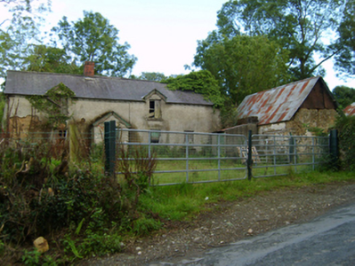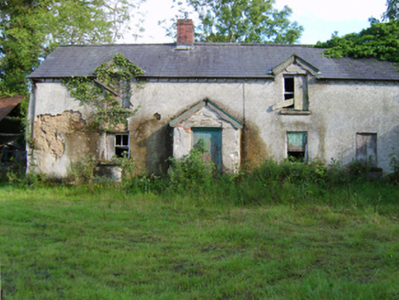 Detached three-bay single-storey lobby entry farmhouse with half-dormer attic, extant 1839, on a T-shaped plan centred on single-bay single-storey gabled windbreak. Now disused. Pitched slate roof including gablets to window openings to half-dormer attic; pitched (gabled) slate roof (windbreak), clay ridge tiles off-centred on red brick Running bond chimney stack having stringcourse below capping, decorative timber bargeboards to gables with finials now missing, and no rainwater goods surviving on exposed timber rafters retaining cast-iron downpipes. Fine roughcast battered walls. Square-headed central door opening with overgrown threshold, and concealed dressings including timber lintel framing timber boarded door. Square-headed flanking window openings with concrete sills, and concealed dressings framing boarded-up three-over-three (ground floor) or one-over-one (half-dormer attic) timber sash windows. Set back from road in unkempt grounds.