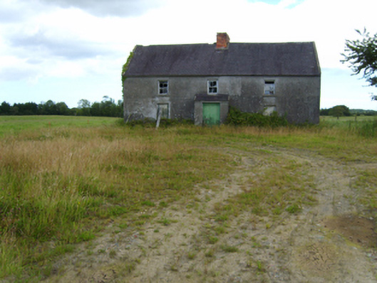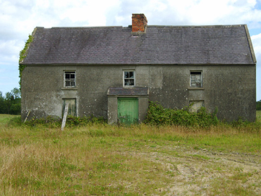 Detached three-bay single-storey lobby entry farmhouse with half-dormer attic, extant 1840, on a T-shaped plan centred on single-bay single-storey lean-to windbreak. Now disused. Pitched slate roof with clay ridge tiles centred on red brick Running bond chimney stack having stringcourse below capping, lichen-spotted concrete or rendered coping to gables, and no rainwater goods surviving on rendered eaves. Part creeper- or ivy-covered rendered, ruled and lined. Square-headed central door opening with overgrown threshold, and concealed dressings framing timber boarded door. Square-headed window openings with concrete or rendered sills, and concealed dressings framing two-over-two timber sash windows having part exposed sash boxes. Set back from road in unkempt grounds.