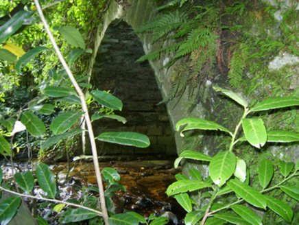 Single-arch road bridge over river, extant 1839. Creeper- or ivy-covered walls with overgrown coping to parapets. Single segmental arch between creeper- or ivy-covered battered piers with lichen-spotted granite ashlar voussoirs. Sited spanning Urrin River with unkempt banks to river.