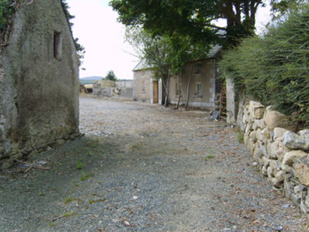 Detached four-bay single-storey lobby entry farmhouse with half-dormer attic, extant 1839, on a rectangular plan off-centred on single-bay single-storey flat-roofed windbreak. Now disused. Pitched slate roof on collared timber construction with clay ridge tiles, red brick Running bond chimney stack having stringcourse below capping, lichen-spotted coping to gables, and cast-iron rainwater goods on rendered eaves retaining cast-iron downpipes. Gritdashed roughcast battered walls on rusticated rendered plinth with rusticated rendered quoins to corners; rendered surface finish to rear (north) elevation. Square-headed off-central door opening with concrete threshold, and concealed dressings framing timber boarded or tongue-and-groove timber panelled door. Square-headed window openings with concrete sills, and concealed dressings framing two-over-two (ground floor) or three-over-three (half-dormer attic) timber sash windows having part exposed sash boxes with one-over-one (ground floor) or two-over-two (half-dormer attic) timber sash windows to side elevations. Set in unkempt grounds.