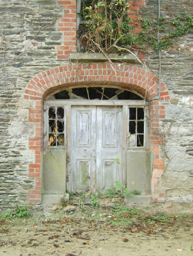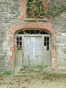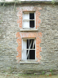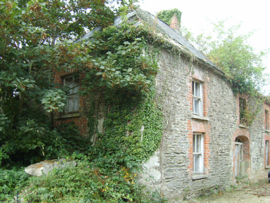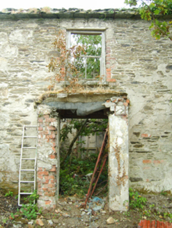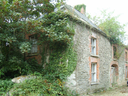 Detached three-bay two-storey farmhouse, extant 1921, on a rectangular plan with single-bay two-storey side elevations. Now in ruins. Remains of hipped slate roof on collared timber construction with clay ridge tiles, paired red brick Running bond central chimney stacks having corbelled stepped capping, and no rainwater goods surviving on slate flagged eaves. Part creeper- or ivy-covered fine roughcast coursed rubble stone battered walls with rough hewn granite flush quoins to corners. Hipped segmental-headed central door opening in segmental-headed recess with reeded timber mullions on step threshold supporting reeded timber transom, and red brick block-and-start surround framing timber panelled double doors having sidelights below fanlight. Square-headed window openings with cut-granite sills, and red brick block-and-start surrounds framing two-over-two timber sash windows. Interior including (ground floor): central hall with remains of timber surrounds to door openings framing timber panelled doors; and remains of timber surrounds to door openings to remainder framing timber panelled doors with timber panelled shutters to window openings. Set in unkempt grounds.