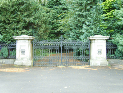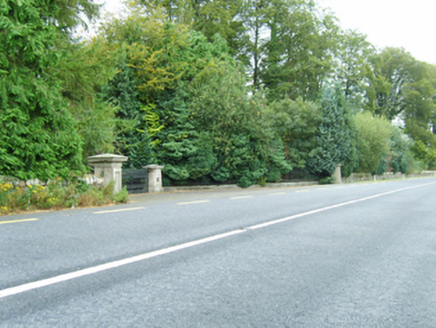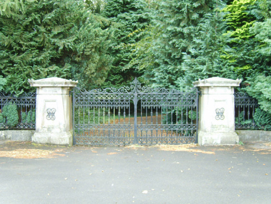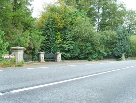 Gateway, built 1862, on a symmetrical plan comprising pair of cut-granite panelled piers on moulded cushion courses on plinths having "Acroterion"-detailed cornice capping on rosette-detailed friezes supporting cast-iron double gates with cut-granite panelled outer piers on moulded cushion courses on plinths having shallow pyramidal capping on blind friezes supporting cast-iron serpentine railings. Installed, 1977. Road fronted at entrance to grounds of Farmley House.