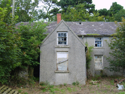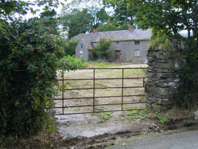 Detached five-bay single-storey farmhouse with half-dormer attic, extant 1839, on a T-shaped plan off-centred on single-bay single-storey gabled projecting bay. Occupied, 1901; 1911. Vacated, 1995. Now disused. Hipped and pitched slate roof on collared timber construction off-centred on pitched (gabled) slate roof, clay ridge tiles, red brick Running bond chimney stacks having stepped capping, creeper- or ivy-covered concrete or rendered coping to gables, and cast-iron rainwater goods on slate flagged eaves retaining cast-iron downpipes. Part creeper- or ivy-covered fine roughcast battered walls. Hipped square-headed off-central door opening with cut-limestone step threshold, and concealed dressings framing timber boarded door having sidelights. Square-headed window openings with cut-granite sills, and concealed dressings framing six-over-six (ground floor) or three-over-six (half-dormer attic) timber sash windows having part exposed sash boxes. Set in unkempt grounds perpendicular to road with piers to perimeter having rubble stone solder course capping supporting iron "farm gate".
