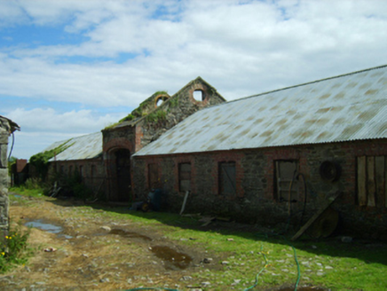 Farmyard complex, built 1858, including (north): Detached three-bay two-storey steward's house on a T-shaped plan with single-bay (three-bay deep) two-storey projecting end bay. Sold, 1880. Occupied, 1901; 1911. Pitched slate roof on a T-shaped plan with clay ridge tiles, red brick Running bond chimney stacks having corbelled stepped capping, timber bargeboards to gables on timber purlins, and remains of cast-iron rainwater goods on chevron- or saw tooth-detailed red brick cornice retaining cast-iron octagonal or ogee hoppers and downpipes. Part creeper- or ivy-covered coursed rubble stone walls with cut- or hammered granite flush quoins to corners. Central door opening into house. Square-headed window openings with cut-granite sills, and red brick block-and-start surrounds framing one-over-one (ground floor) or three-over-three (first floor) timber sash windows; (west): Detached nine-bay single-storey outbuilding on a rectangular plan. Pitched slate roof with clay ridge tiles centred on red brick Running bond chimney stack having corbelled stepped capping, and no rainwater goods surviving on chevron- or saw tooth-detailed red brick cornice. Part creeper- or ivy-covered coursed rubble stone walls with lichen-spotted flush quoins to corners. Series of nine square-headed door openings with red brick block-and-start surrounds framing timber boarded half-doors; (east): Detached nine-bay single-storey outbuilding with half-attic on a rectangular plan. Pitched slate roof on collared timber construction with clay ridge tiles, and no rainwater goods surviving on chevron- or saw tooth-detailed red brick cornice. Part creeper- or ivy-covered coursed rubble stone walls with lichen-spotted flush quoins to corners centred on cast-iron "Pattress" tie plates. Square-headed central door opening with red brick block-and-start surround. Square-headed window openings with cut-granite sills, and red brick block-and-start surrounds framing concrete block infill (ground floor) or timber boarded fittings (half-attic). Pair of elliptical-headed carriageways with red brick block-and-start surrounds having stepped reveals; (far south): Detached twenty-one-bay single-storey outbuilding on a symmetrical plan with single-bay single-storey higher central bay. Reroofed, ----. Replacement pitched corrugated-iron roofs centred on remains of pitched slate roof, pressed iron ridges, and no rainwater goods surviving on chevron- or saw tooth-detailed red brick cornices. Part creeper- or ivy-covered coursed rubble stone walls with red brick flush quoins to corners. Elliptical-headed central carriageway with red brick block-and-start surround having stepped reveals. Square-headed window openings with red brick header bond sills, and red brick block-and-start surrounds with fittings now boarded-up. Set in own grounds.