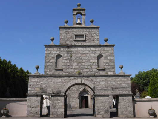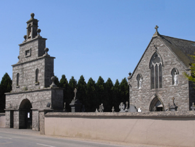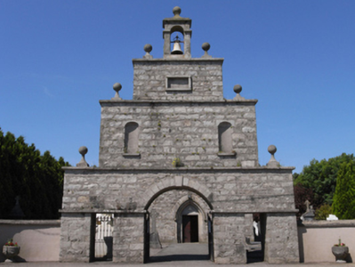 "Triumphal Gateway", built 1859-60, on a symmetrical plan. Repointed coursed rubble granite walls with ball finial-topped cut-granite coping including ball finial-topped cut-granite coping (top tier) centred on cut-granite bellcote framing embossed cast-iron bell. Square-headed gateways centred on segmental-headed gateway with repointed granite ashlar voussoirs centred on cut-granite keystone framing wrought iron double gates. Road fronted at entrance to grounds of Saint Anne's Catholic Church.