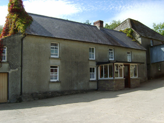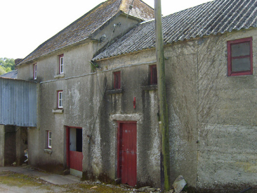 Mill complex, established 1832, including (north): Attached two-bay two-storey mill with half-attic on a square plan. Hipped gabled slate roof with lichen-covered clay ridge tiles, and no rainwater goods surviving on slate flagged eaves. Fine roughcast battered walls with concealed cut- or hammered limestone flush quoins to corners. Pair of square-headed door openings with concealed dressings framing timber boarded half-doors. Square-headed window openings (upper floors) with cut-granite sills, and concealed dressings framing timber casement windows. Interior retaining timber boarded floors on timber joists on timber beams on timber posts; (south): Attached four-bay two-storey farmhouse on a rectangular plan. Pitched slate roof with clay ridge tiles, red brick Running bond chimney stack having corbelled stepped capping, and cast-iron rainwater goods on rendered eaves retaining cast-iron downpipes. Rendered, ruled and lined walls on rendered plinth. Square-headed off-central door opening. Square-headed window openings with lichen-spotted sills, and concealed dressings framing two-over-two timber sash windows. Set in own grounds with rendered piers to perimeter having cornices below truncated pyramidal capping supporting wrought iron-detailed flat iron double gates.