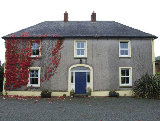 Detached three-bay two-storey farmhouse, built 1901, on a T-shaped plan with single-bay (two-bay deep) two-storey lower central return (south). Occupied, 1911. Renovated, ----. Replacement hipped artificial slate roof on a T-shaped plan centred on pitched artificial slate roof (south) with ridge tiles, paired red brick Running bond central chimney stacks having stringcourses below capping supporting terracotta pots, rooflights (south), and uPVC rainwater goods on roughcast slate flagged eaves. Part creeper- or ivy-covered roughcast walls bellcast over rendered plinth with rendered "bas-relief" strips to corners. Segmental-headed central door opening with cut-granite step threshold, timber doorcase with fluted pilasters supporting shallow cornice on fluted frieze, and rendered "bas-relief" surround framing timber panelled double doors having sidelights on panelled risers below overlight. Square-headed window openings with cut-granite sills, and rendered "bas-relief" surrounds framing replacement two-over-two sash windows. Interior including (ground floor): central hall retaining carved timber surrounds to door openings framing timber panelled doors; and carved timber surrounds to door openings to remainder framing timber panelled doors with timber panelled shutters to window openings. Set back from line of road in landscaped grounds.