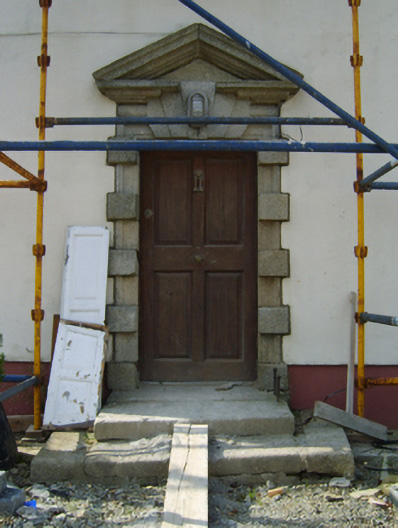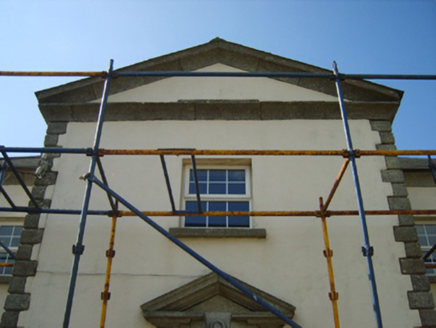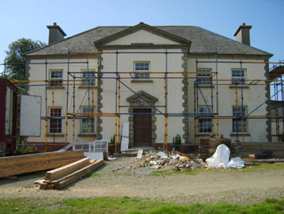 Detached three- or five-bay two-storey farmhouse, extant 1806, on a T-shaped plan centred on single-bay two-storey pedimented projecting breakfront; two-bay two-storey side elevations. Sold, 1885. Vacant, 1901. Occupied, 1911. Renovated, ----. Undergoing restoration, 2007. Replacement hipped artificial slate roof on a T-shaped plan centred on pitched (gabled) artificial slate roof, clay ridge tiles, cement rendered chimney stacks having concrete capping supporting ribbed terracotta tapered pots, and no rainwater goods surviving on cut-granite "Cavetto" cornice. Replacement cement rendered walls bellcast over rendered plinth with rusticated cut-granite quoins to corners including rusticated cut-granite quoins to corners (breakfront) supporting cut-granite "Cavetto" cornice. Square-headed central door opening with two cut-granite steps supporting cast-iron bootscrapers, cut-granite block-and-start surround with "Cyma Recta"- or "Cyma Reversa"-detailed pediment on pulvinated frieze framing replacement timber panelled door. Square-headed window openings with cut-granite sills, and concealed dressings framing replacement uPVC casement windows replacing eight-over-eight (ground floor) or three-over-three (first floor) timber sash windows. Interior undergoing reconstruction, 2007. Set in unkempt landscaped grounds.