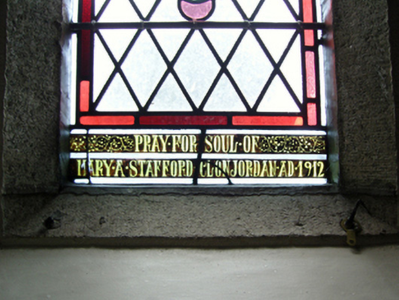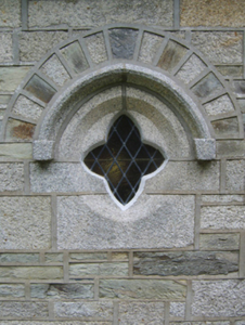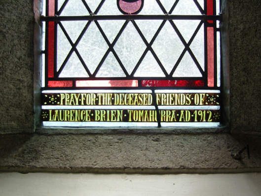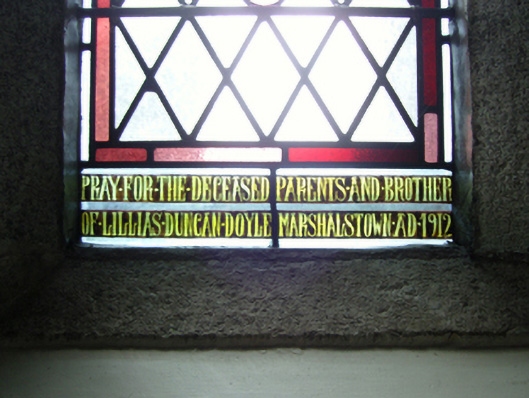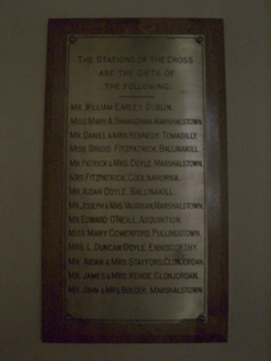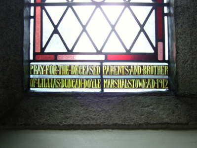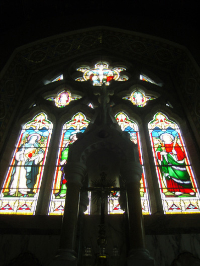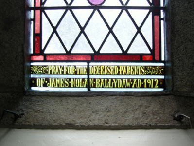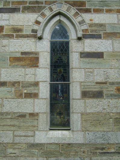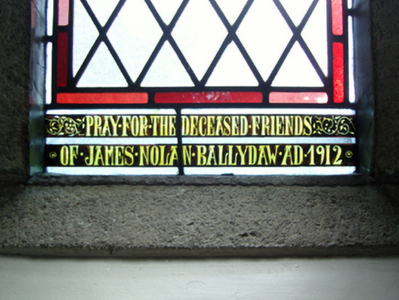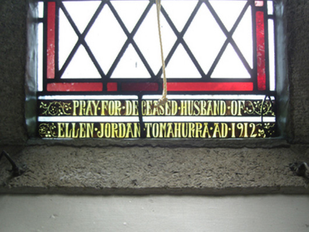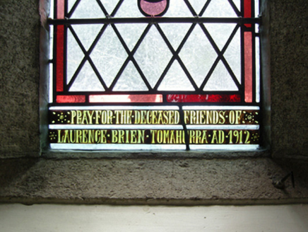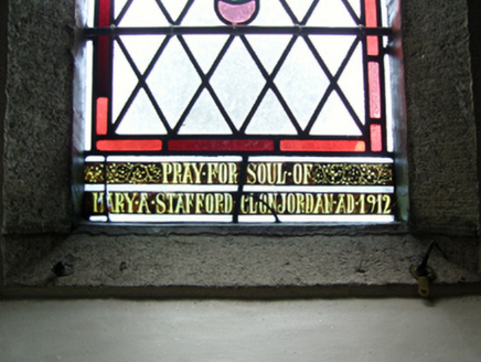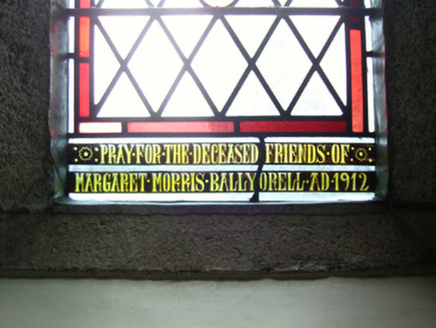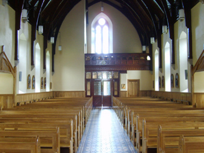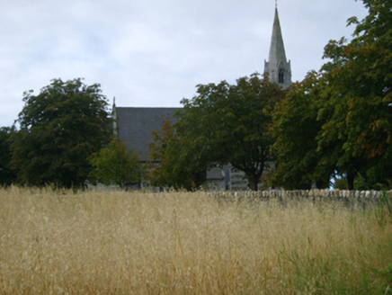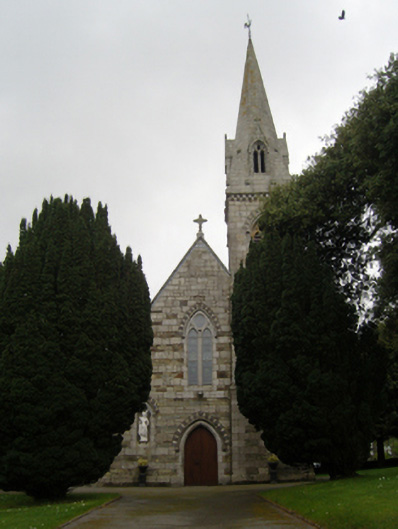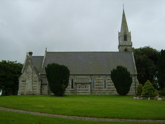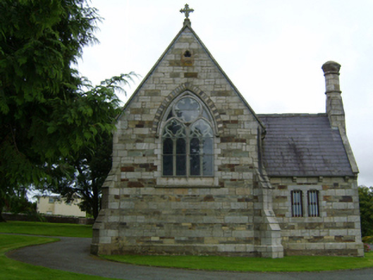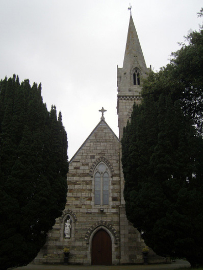 Detached ten-bay double-height Catholic church, dated 1873; opened 1873, on a rectangular plan comprising eight-bay double-height nave opening into two-bay double-height chancel (east); single-bay three-stage tower (south-west) on a square plan supporting broach spire. Renovated, 1912, with interior "improved". Renovated, 1940, with sanctuary "improved". Renovated, 1976, with sanctuary reordered. Restored, 2000-1. Pitched slate roofs with roll moulded clay ridge tiles, cut-granite coping to gables on cut-granite ogee kneelers with Cross finials to apexes; and cast-iron rainwater goods on cut-granite "Cavetto" consoles retaining cast-iron downpipes. Repointed cut-granite banded snecked rubble stone walls on benchmark-inscribed cut-granite chamfered cushion course on plinth with cut-granite diagonal stepped buttresses to corners having cut-granite "slated" coping. Lancet window openings, cut-granite block-and-start surrounds having chamfered reveals with hood mouldings on monolithic label stops framing storm glazing over fixed-pane fittings having stained glass margins centred on leaded stained glass panels. Hexafoil-detailed pointed-arch window opening (east) with cut-granite thumbnail beaded sill, cut-granite mullions, and cut-granite block-and-start surround having chamfered reveals with hood moulding on monolithic label stops framing storm glazing over fixed-pane fittings having leaded stained glass panels. Pointed-arch door opening to entrance (west) front with cut-granite threshold, and cut-granite block-and-start surround having chamfered reveals with hood moulding on monolithic label stops framing timber boarded double doors. Pointed-arch window opening (gable) with cut-granite Y-mullion, and cut-granite block-and-start surround having chamfered reveals with hood moulding on monolithic label stops framing storm glazing over fixed-pane fittings having stained glass margins centred on leaded stained glass panels. Interior including vestibule (west); square-headed door opening into nave with glazed timber panelled double doors having sidelights on panelled risers below overlight; full-height interior open into roof restored, 2000-1, with arcaded choir gallery (west) below stained glass memorial "West Window" (1912), encaustic tiled central aisle between Maltese Cross-detailed timber pews, timber boarded or tongue-and-groove timber panelled wainscoting supporting carved timber dado rail, paired timber stations between stained glass memorial windows (1912), exposed pointed-arch braced scissor truss timber roof construction on cut-granite corbels with wind braced timber boarded ceiling on carved timber cornice, and carpeted cut-veined white marble stepped dais to sanctuary (east) reordered, 1976, with pointed-arch chancel arch framing Gothic-style high altar below stained glass memorial "East Window" (1912) in mosaic tiled surround. Set in landscaped grounds with cut-granite piers to perimeter having cut-granite chamfered capping supporting "Fleur-de-Lys"-detailed wrought iron double gates.