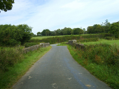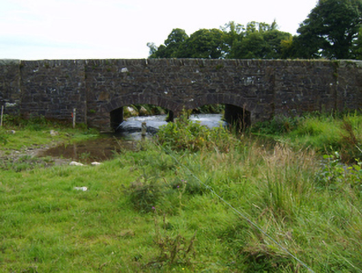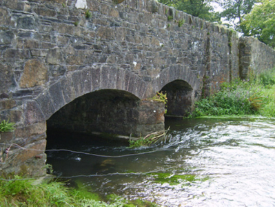 Two-arch road bridge over stream, extant 1904. Broken coursed rubble stone battered walls between broken coursed rubble stone battered piers with cut-granite shallow pyramidal capping centred on rubble stone angled soldier course coping. Pair of camber or segmental arches with granite ashlar voussoirs. Sited spanning stream with unkempt banks to stream.