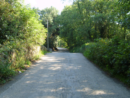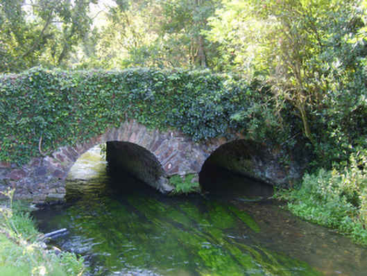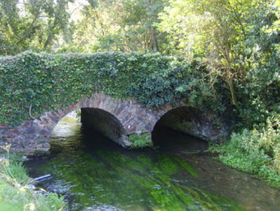 Two-arch hump back road bridge over stream, extant 1840. Part creeper- or ivy-covered walls with overgrown coping to parapets. Pair of round arches with lichen-spotted voussoirs. Sited spanning stream with unkempt banks to stream.
