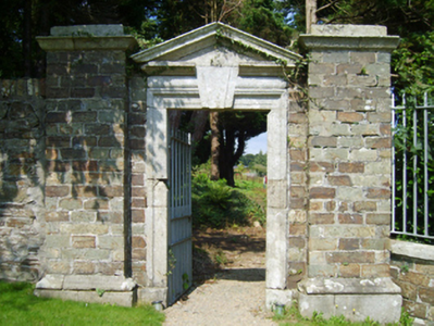 Gateway, extant 1903, on a symmetrical plan comprising pair of tuck pointed Running bond piers on moulded cushion courses on plinths having cut-granite "Cyma Recta" or "Cyma Reversa" cornices below capping supporting wrought iron double gates with paired tuck pointed Running bond outer piers on moulded cushion courses on plinths having cut-granite "Cyma Recta" or "Cyma Reversa" cornices below capping framing wrought iron gates. Road fronted on a corner site at entrance to grounds of Monart.
