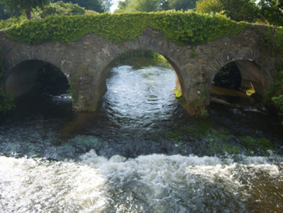 Three-arch hump back road bridge over river, extant 1840. Part creeper- or ivy-covered walls centred on triangular cutwaters to piers having pyramidal capping with overgrown rubble stone soldier course coping to parapets. Series of three round arches with schist-inserted repointed voussoirs. Sited spanning Urrin River with unkempt banks to river.