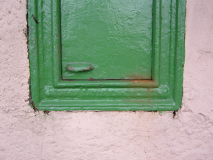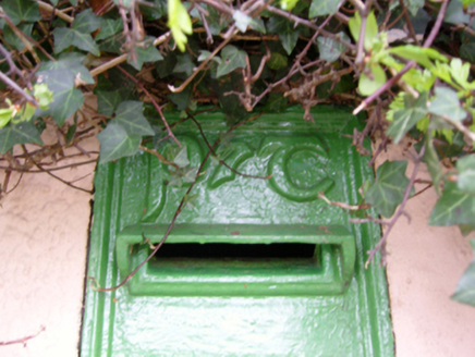 A "wall box" post box supplied by Jessop Davis (closed 1962) of Enniscorthy representing an interesting example of mass-produced cast-iron work making a pleasing, if largely inconspicuous visual statement in a rural street scene with embellishments identifying the artistic potential of the composition including the Cló Gaelach or "Old Irish Lettering" defining the monogram of the Department of Posts and Telegraphs (fl. 1924-84).