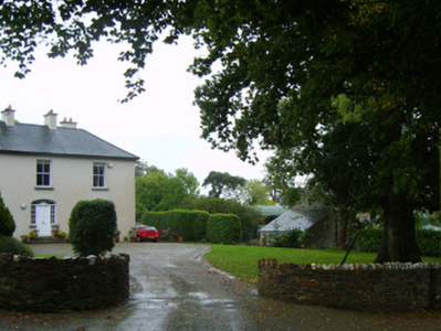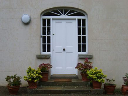 Detached three-bay two-storey farmhouse, extant 1853, on an L-shaped plan with single-bay (north) or two-bay (south) two-storey side elevations. Occupied, 1911. Hipped slate roof on an L-shaped plan with clay ridge tiles, paired rendered central chimney stacks having concrete capping supporting terracotta pots, and replacement uPVC rainwater goods on rendered eaves. Rendered, ruled and lined walls. Hipped segmental-headed central door opening approached by two cut-granite steps, timber mullions on cut-granite step threshold supporting timber transom, and concealed dressings framing timber panelled door having sidelights below fanlight. Square-headed window openings with cut-granite sills, and concealed dressings framing two-over-two timber sash windows. Set in landscaped grounds.