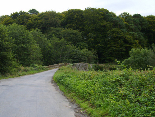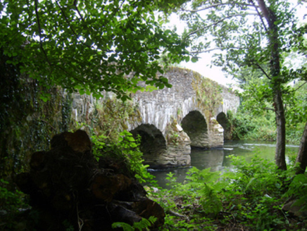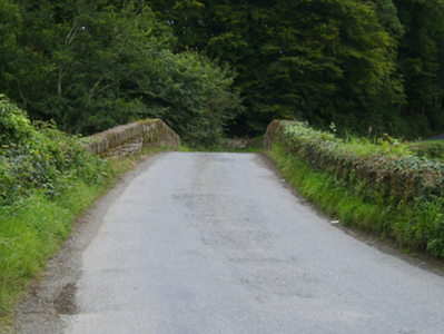 Three-arch hump back road bridge over river, extant 1840. Part creeper- or ivy-covered walls centred on triangular cutwaters to piers to pyramidal capping with rubble stone soldier course coping to parapets. Series of three arches with lichen-spotted voussoirs. Sited spanning Bann River with unkempt banks to river.