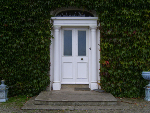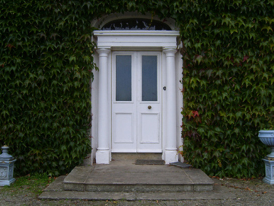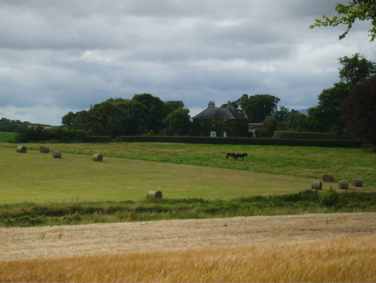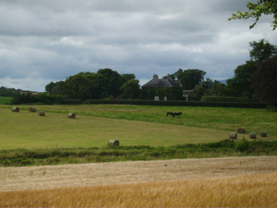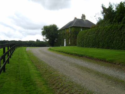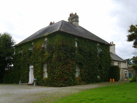 Detached three-bay two-storey farmhouse, extant 1853, on a square plan with two-bay two-storey side elevations. Occupied, 1911. Sold, 1924. Resold, 1939. Resold, 1944. Refenestrated, ----. Hipped slate roof on a U-shaped plan with clay ridge tiles, paired rendered central chimney stacks on axis with ridge having "Cyma Recta" or "Cyma Reversa" stringcourses below capping supporting louvered terracotta pots, and cast-iron rainwater goods on rendered slate flagged eaves retaining cast-iron octagonal or ogee hoppers and downpipes. Creeper- or ivy-covered rendered, ruled and lined walls on rendered plinth. Segmental-headed central door opening with cut-granite step threshold, doorcase with engaged columns on plinths supporting shallow cornice on blind frieze on entablature, and concealed dressings framing glazed timber panelled double doors having overlight. Square-headed window openings with cut-granite sills, and concealed dressings framing replacement aluminium casement windows. Interior including (ground floor): central hall retaining carved timber surrounds to door openings framing timber panelled doors; and carved timber surrounds to door openings to remainder framing timber panelled doors with timber panelled shutters to window openings. Set in landscaped grounds.