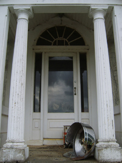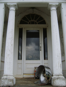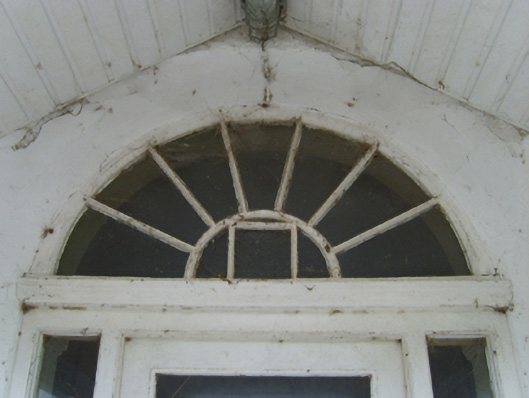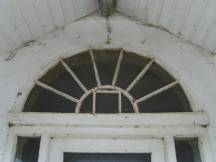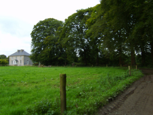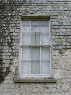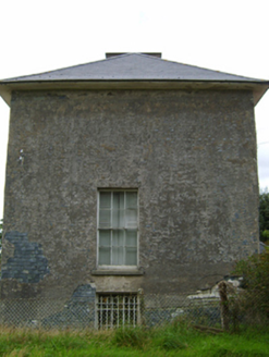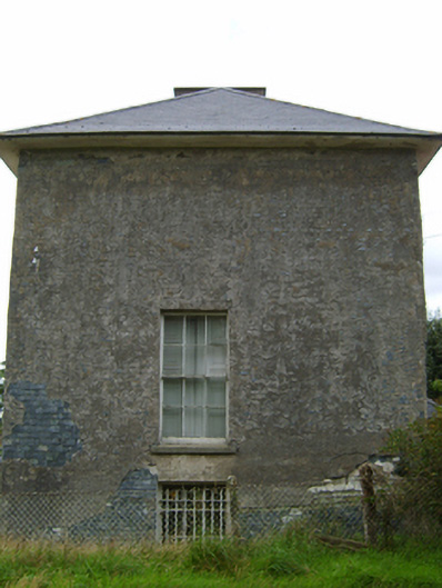 Detached three-bay two-storey over part raised basement farmhouse with dormer attic, extant 1840, on a T-shaped plan centred on single-bay single-storey projecting open porch to ground floor; three-bay full-height rear (east) elevation. "Improved", pre-1904, producing present composition. Occupied, 1911. Reroofed, 1987. Now disused. Replacement hipped artificial slate roof with clay ridge tiles, paired cement rendered central chimney stacks having concrete capping supporting terracotta pots, rooflights to rear (east) pitch, and no rainwater goods surviving on slightly overhanging rendered slate flagged eaves. Roughcast battered wall to front (west) elevation; roughcast slate hung surface finish (remainder). Segmental-headed central door opening approached by flight of eight cut-granite steps between wrought iron railings, bull nose-detailed timber mullions supporting "Cyma Recta"- or "Cyma Reversa"-detailed timber transom, and concealed dressings framing glazed timber panelled door having sidelights on panelled risers below fanlight. Square-headed window openings including square-headed window openings to rear (east) elevation centred on segmental-headed window opening (half-landing), cut-granite sills, and concealed red brick block-and-start surrounds framing three-over-six (basement), six-over-six (ground floor) or three-over-six (first floor) timber sash windows with three-over-six timber sash windows to rear (east) elevation centred on fixed-pane fitting having fanlight. Interior including (ground floor): central hall retaining carved timber surrounds to door openings framing timber panelled doors; and carved timber surrounds to door openings to remainder framing timber panelled doors with timber panelled shutters to window openings. Set in unkempt grounds with roughcast piers to perimeter having moss-covered capping.