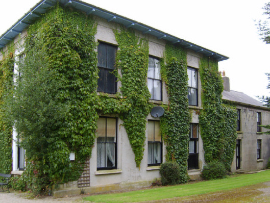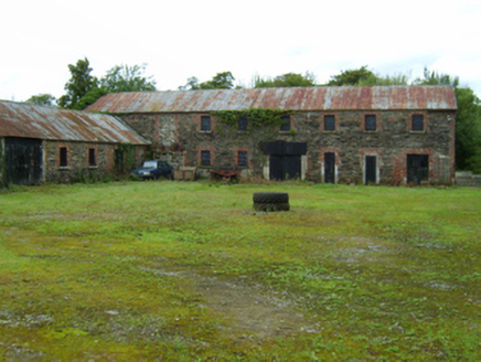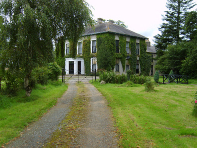 Detached three-bay two-storey farmhouse with dormer attic, extant 1853, on a cruciform plan centred on single-bay single-storey flat-roofed projecting porch to ground floor; three-bay two-storey side elevations with single-bay (single-bay deep) two-storey lean-to shallow central return (north). Occupied, 1911. Hipped slate roof on a quadrangular plan extending into lean-to slate roof (north) with clay ridge tiles, paired yellow brick Running bond central chimney stacks on yellow brick Running bond bases having corbelled stepped capping supporting terracotta pots, rooflights to rear (north) pitch, and cast-iron rainwater goods on timber eaves boards on slightly overhanging timber boarded eaves having timber consoles. Creeper- or ivy-covered rendered, ruled and lined walls on moulded cushion course on rendered plinth with rusticated rendered quoins to corners supporting rendered band to eaves. Central door opening into farmhouse. Square-headed window openings to front (south) elevation with cut-granite sills, and moulded rendered surrounds framing two-over-two timber sash windows. Square-headed window openings (remainder) with cut-granite sills, and concealed dressings framing two-over-two timber sash windows. Interior including (ground floor): central hall retaining carved timber surrounds to door openings framing timber panelled doors; and carved timber surrounds to door openings to remainder framing timber panelled doors with timber panelled shutters to window openings. Set in landscaped grounds with rendered, ruled and lined piers to perimeter having cut-granite shallow pyramidal capping supporting wrought iron double gates.