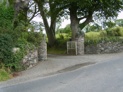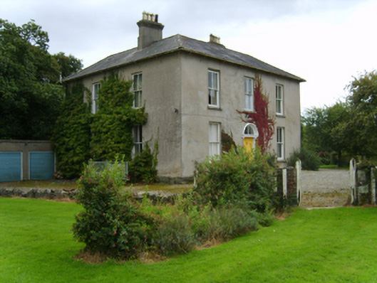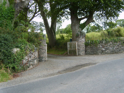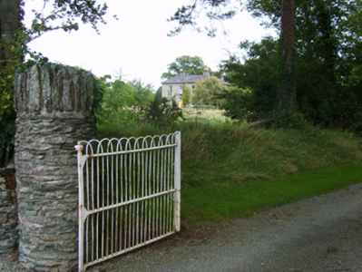 Detached three-bay two-storey farmhouse, built 1862, on a square plan with two-bay (north) or three-bay (south) two-storey side elevations; single-bay (single-bay deep) full-height central return (east). Occupied, 1901; 1911. Damaged, 1941. Sold, 1953. Hipped slate roof on an E-shaped plan with clay ridge tiles, rendered chimney stacks on rendered bases on axis with ridge having corbelled stepped capping supporting terracotta or yellow terracotta tapered pots, and cast-iron rainwater goods on slate flagged eaves retaining cast-iron downpipes. Part creeper- or ivy-covered rendered wall to front (west) elevation bellcast over coursed rubble limestone plinth; part creeper- or ivy-covered fine roughcast surface finish (remainder). Segmental-headed central door opening with cut-granite step threshold, timber doorcase with panelled pilasters supporting "Cavetto"- detailed cornice on fluted consoles, and concealed dressings with hood moulding on ogee label stops framing timber panelled double doors having overlight. Square-headed window openings with cut-granite sills, and concealed dressings framing two-over-two timber sash windows. Interior including (ground floor): central hall retaining carved timber surrounds to door openings framing timber panelled doors, and moulded plasterwork cornice to ceiling; and carved timber surrounds to door openings to remainder framing timber panelled doors with carved timber surrounds to window openings framing timber panelled shutters. Set in landscaped grounds with cylindrical piers to perimeter having soldier course capping supporting looped wrought iron double gates.