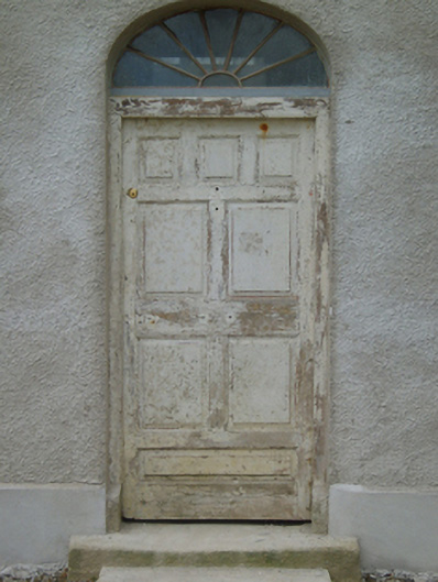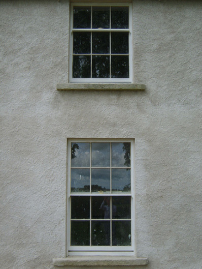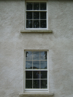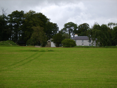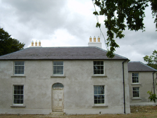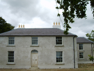 Detached three-bay two-storey farmhouse, extant 1811, on a rectangular plan with two-bay two-storey side elevations centred on single-bay (single-bay deep) full-height return (west). Occupied, 1911. Derelict, 1999. For sale, 2006. Undergoing "restoration", 2007. Replacement hipped slate roof on an E-shaped plan centred on pitched slate roof (west) with pressed or rolled iron ridges, rendered chimney stacks on axis with ridge having stepped capping supporting yellow terracotta tapered pots, rooflights (west), and cast-iron rainwater goods on rendered eaves retaining cast-iron downpipes. Replacement fine roughcast battered walls on rendered plinth. Segmental-headed central door opening approached by two steps with concealed dressings framing timber panelled door having fanlight. Square-headed window openings with cut-granite sills, and concealed dressings framing six-over-six (ground floor) or three-over-six (first floor) timber sash windows. Set in unkempt grounds.