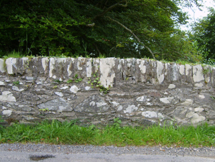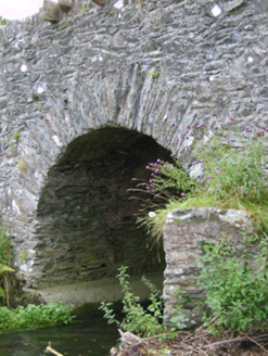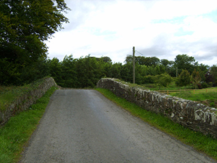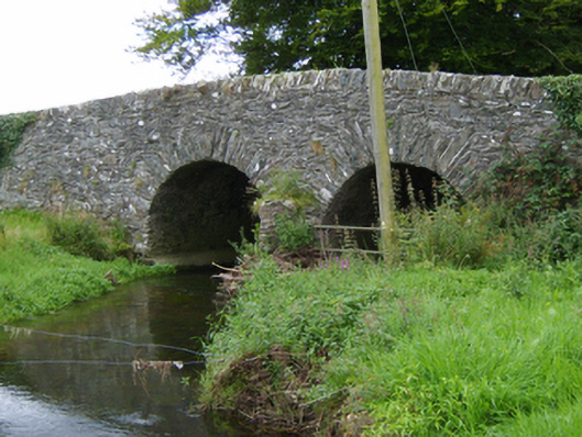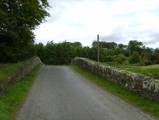 Two-arch hump back road bridge over stream, extant 1840. Part creeper- or ivy-covered walls centred on triangular cutwaters to pier having overgrown capping with rubble stone or schist soldier course coping to parapets. Pair of round arches with lichen-spotted rubble stone or schist voussoirs. Sited spanning stream with unkempt banks to stream.