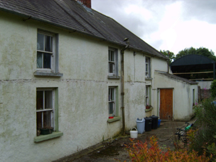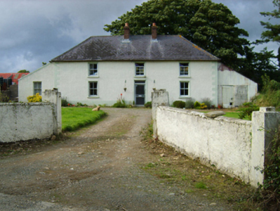 Detached three-bay two-storey farmhouse, extant 1921, on a rectangular plan with three-bay two-storey rear (north) elevation. Hipped slate roof with clay ridge tiles, paired red brick Running bond central chimney stacks having corbelled stepped capping supporting terracotta pots, and cast-iron rainwater goods on rendered eaves retaining cast-iron downpipes. Roughcast walls on rendered plinth with rendered "bas-relief" quoined piers to corners. Square-headed central door opening with concrete step threshold, and rendered "bas-relief" surround framing replacement glazed aluminium door having overlight. Square-headed window openings with concrete sills, and rendered "bas-relief" surrounds framing two-over-two timber sash windows. Square-headed window openings to rear (north) elevation with concrete sills, and concealed dressings framing two-over-two timber sash windows. Set back from road with rendered piers to perimeter having stepped capping.