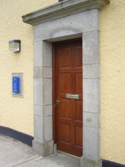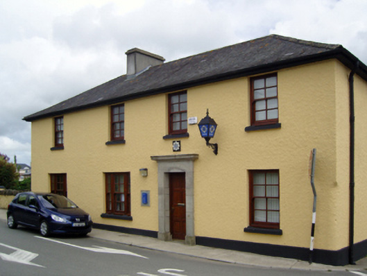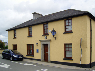 Detached four-bay two-storey Garda Síochána station, rebuilt 1925; opened 1927, on a rectangular plan with single-bay two-storey side elevations. Refenestrated, ----. Hipped slate roof with clay ridge tiles, cement rendered chimney stack having stepped capping, and cast-iron rainwater goods on timber box eaves retaining cast-iron downpipes. Roughcast walls on rendered chamfered plinth. Square-headed door opening with cut-granite monolithic surround supporting cornice framing replacement timber panelled door. Square-headed window openings in tripartite arrangement (north) with concrete sills, and concealed dressings framing replacement four-over-four sash windows having two-over-two sidelights. Square-headed window openings (remainder) with concrete sills, and concealed dressings framing replacement four-over-four sash windows. Street fronted on a corner site with concrete footpath to front.