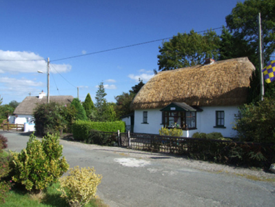 Detached four-bay single-storey lobby entry thatched house, extant 1840, on a rectangular plan off-centred on single-bay single-storey lean-to windbreak. Refenestrated, ----. Reroofed, ----. Chicken wire-covered replacement hipped oat thatch roof with exposed hazel lattice stretchers to ridge having exposed scallops, cement rendered off-central chimney stack having concrete capping supporting terracotta pot, and exposed hazel stretchers to eaves having exposed scallops. Roughcast battered walls. Square-headed off-central door opening with concealed dressings framing replacement uPVC panelled door replacing timber panelled door. Square-headed window openings with concrete sills, and concealed dressings framing replacement uPVC casement windows replacing two-over-two timber sash windows. Set back from line of bypassed road in landscaped grounds.