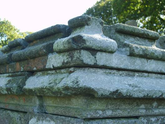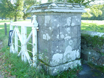 Gateway, built 1844, on a symmetrical plan comprising pair of lichen-spotted granite ashlar piers on cut-granite plinths having battlemented capping supporting quatrefoil-detailed timber double gates. Road fronted at entrance to grounds of Wells House.