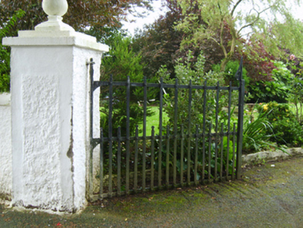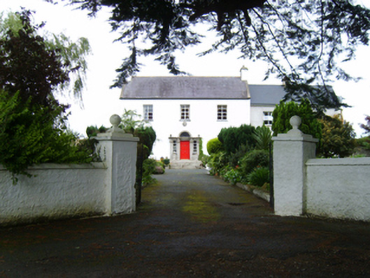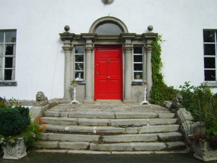 Detached three-bay two-storey part double-pile over part raised basement farmhouse, built 1702; extant 1777, on an L-shaped plan originally three-bay two-storey double-pile. Burnt, 1798. Vacant, 1837. Truncated, pre-1903, producing present composition. Occupied, 1911. Sold, 1939. Renovated, ----. Pitched part double-pile (M-profile) slate roof with clay ridge tiles, concrete or rendered coping to gables with rendered red brick Running bond chimney stacks to apexes having stringcourses below capping supporting terracotta pots, rooflights to rear (west) pitch, and replacement uPVC rainwater goods on rendered slate flagged eaves retaining cast-iron octagonal or ogee hoppers and downpipes. Rendered walls on cut-granite chamfered cushion course on rendered base with rusticated rendered quoins to ends; part creeper- or ivy-covered roughcast surface finish to rear (west) elevation. "Venetian Door" approached by flight of six cut-granite steps, cut-granite doorcase with engaged columns on padstones supporting ball finial-topped "Cyma Recta" or "Cyma Reversa" cornice on blind frieze on broken entablature, and concealed dressings framing replacement timber panelled door having overlight with fixed-pane sidelights. Square-headed window openings with cut-granite sills, and concealed red brick block-and-start surrounds framing replacement aluminium casement windows. Set in landscaped grounds with roughcast diagonal piers to perimeter having ball finial-topped stepped capping supporting flat iron double gates.