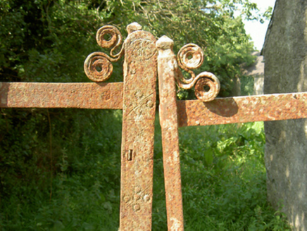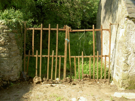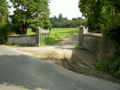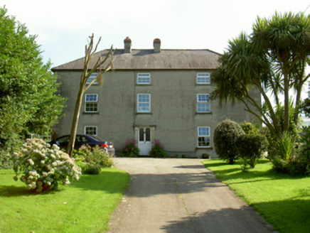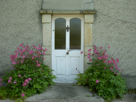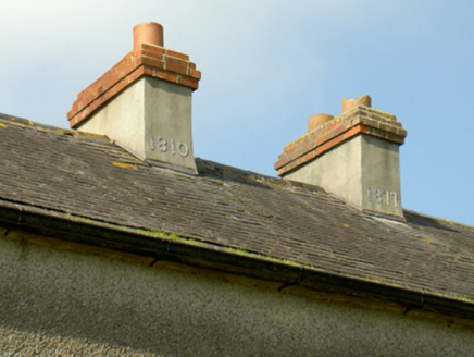 Detached three-bay two-storey farmhouse with half-dormer attic, rebuilt 1877, on a rectangular plan with single-bay (north) or two-bay (south) full-height side elevations. Occupied, 1911. Refenestrated, ----. Hipped slate roof with clay ridge tiles, date stone-detailed paired rendered red brick Running bond central chimney stacks ("1810"; "1877") having corbelled stepped capping supporting terracotta pots, and replacement uPVC rainwater goods on rendered slate flagged eaves. Roughcast battered walls on rendered plinth with rusticated rendered quoins to corners. Square-headed central door opening originally round-headed with concrete step threshold, and cut-granite block-and-start surround framing glazed timber panelled door. Square-headed window openings with cut-granite sills, and rendered "bas-relief" surrounds framing replacement uPVC casement windows replacing six-over-six or three-over-three (half-dormer attic) timber sash windows. Set in landscaped grounds with rendered piers to perimeter having pyramidal capping supporting looped flat iron double gates.