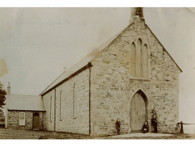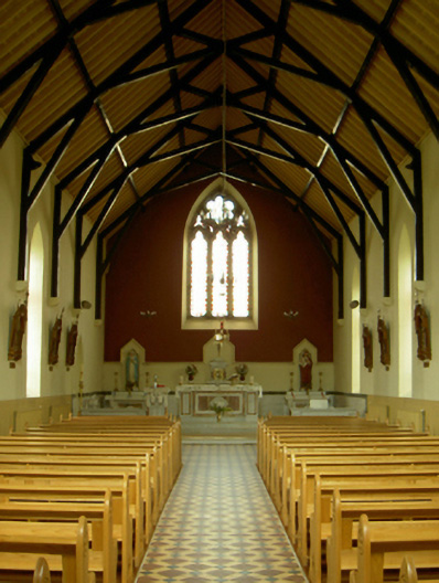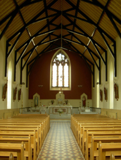 Detached four-bay double-height single-cell Catholic church, built 1888, on a rectangular plan; single-bay single-storey gabled projecting porch (south). Renovated, 1988, with sanctuary reordered. Restored, 2004. Pitched slate roof with roll moulded clay ridge tiles, concrete coping to gables on cut-granite "Cavetto" kneelers including concrete coping to gable (south) on cut-granite "Cavetto" kneelers with rendered gabled bellcote to apex framing cast-iron bell, and replacement uPVC rainwater goods on rendered eaves with cast-iron downpipes. Rendered, ruled and lined coursed rubble stone walls with concealed cut-granite flush quoins to corners. Lancet window openings with cut-granite sills, and concealed red brick block-and-start surrounds framing storm glazing over fixed-pane fittings having stained glass margins centred on leaded stained glass quatrefoils. Hexafoil-detailed pointed-arch window opening (north) with cut-granite mullions, and cut-granite block-and-start surround having chamfered reveals with hood moulding on monolithic label stops framing storm glazing over fixed-pane fittings having margined lattice glazing bars. Lancet "Trinity Window" (south) with cut-granite block-and-start surround having chamfered reveals framing storm glazing over fixed-pane fittings having lattice glazing bars. Interior including vestibule (south); pointed-arch door opening into nave with timber boarded double doors having overlight; full-height interior open into roof restored, 2004, with tiled central aisle between Maltese Cross-detailed timber pews, paired Gothic-style timber stations between stained glass memorial windows (----), cut-veined white marble stepped dais to sanctuary (north) reordered, 1988, with arcaded communion railings centred on inlaid cut-veined white marble panelled altar below stained glass "North Window" (----), and exposed braced scissor truss timber roof construction on cut-granite beaded corbels with wind braced rafters to ceiling. Set in landscaped grounds with roughcast-panelled rendered piers to perimeter having cut-granite shallow pyramidal capping supporting spear head-detailed cast-iron double gates.