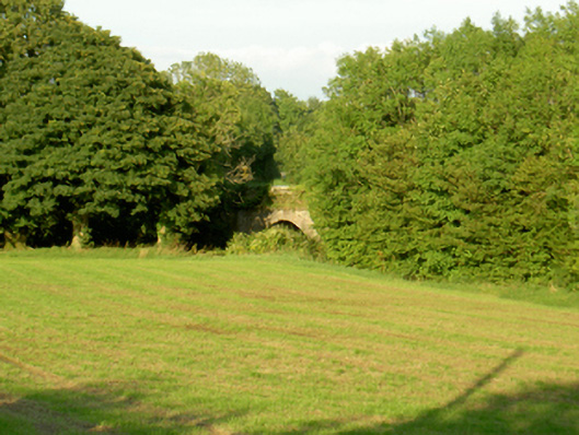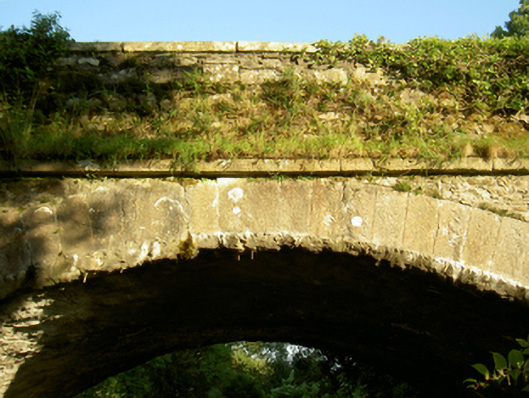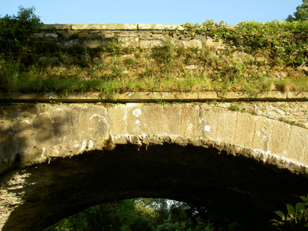 Single-arch road bridge over river, extant 1844. Part creeper- or ivy-covered coursed or snecked rubble stone walls with lichen-spotted cut-granite stringcourses supporting parapets having lichen-spotted cut-granite segmental coping. Single segmental arch with lichen-spotted granite ashlar voussoirs. Sited spanning Boro River with unkempt banks to river.