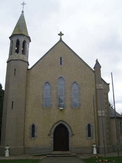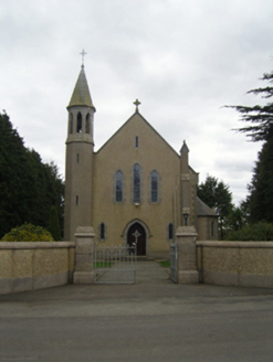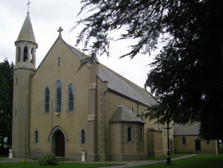 Detached eight-bay double-height Catholic church, designed 1936; built 1937-9; dedicated 1939, on a rectangular plan comprising seven-bay double-height nave opening into single-bay double-height chancel (south); octagonal spire-topped single-bay four-stage turret (north-east) on an octagonal plan. Repaired, 1967. Renovated, 1970, with sanctuary reordered. Pitched slate roofs with roll moulded clay ridge tiles, precast concrete "Cavetto" coping to gables on precast concrete "Cavetto" corbel kneelers with Cross finials to apexes, and cast-iron rainwater goods on precast concrete "Cavetto" consoles retaining cast-iron hoppers and square profile downpipes. Gritdashed roughcast walls on precast concrete chamfered cushion course on plinth with rusticated precast concrete quoins to corners. Lancet window openings centred on "lozenges" with precast concrete block-and-start surrounds having chamfered reveals framing storm glazing over fixed-pane fittings having stained glass margins centred on leaded stained glass quatrefoils. Lancet "Trinity Window" (south) with precast concrete block-and-start surrounds having chamfered reveals framing storm glazing over fixed-pane fittings having stained glass margins centred on leaded stained glass panels. Pointed-arch door opening (north) approached by two precast concrete steps, precast concrete block-and-start surround having chamfered reveals with hood moulding framing diagonal timber boarded double doors. Lancet "Trinity Window" (gable) with precast concrete block-and-start surrounds having chamfered reveals framing storm glazing over fixed-pane fittings having stained glass margins centred on leaded stained glass quatrefoils. Interior including vestibule (north); square-headed door opening into nave with glazed timber panelled double doors having sidelights on panelled risers below overlight; full-height interior with arcaded choir gallery (north) on a half-octagonal plan below stained glass "Trinity Window" (1939), tiled central aisle between cruciform-detailed timber pews, Gothic-style timber stations between stained glass memorial windows (1939), vaulted ceiling in moulded plasterwork frame on moulded plasterwork cornice, and encaustic tiled cut-veined white marble stepped dais to sanctuary (south) reordered, 1970, with pointed-arch chancel arch framing cut-veined white marble panelled altar below stained glass memorial "Trinity Window" (1939). Set in landscaped grounds with precast concrete chamfered piers to perimeter on precast concrete chamfered plinths having precast concrete chamfered stringcourses below capping supporting wrought iron double gates.