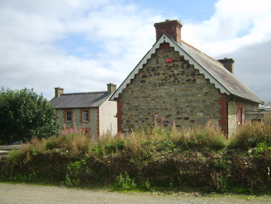 Detached three-bay two-storey teacher's house, built 1906, on a rectangular plan with three-bay two-storey rear (south) elevation. For sale, 2012. Pitched slate roof with trefoil-perforated crested terracotta ridge tiles, concrete or rendered coping to gables with yellow brick Running bond chimney stacks to apexes having precast concrete capping, and replacement uPVC rainwater goods on exposed timber rafters retaining cast-iron downpipes. Fine roughcast walls on cut-granite chamfered plinth. Square-headed central door opening with cut-granite threshold, and red brick block-and-start surround framing timber panelled door having overlight. Square-headed window openings with cut-granite sills, and red brick block-and-start surrounds framing two-over-two timber sash windows. Set in landscaped grounds.